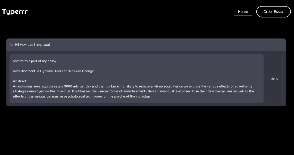 Yes, our AI helper is completely legit. Our platform provides reliable and professional services, ensuring high-quality, plagiarism-free essays tailored to your needs. With secure processes and a user-friendly interface, we are a trusted solution for students and professionals looking for efficient and legitimate essay typing services.